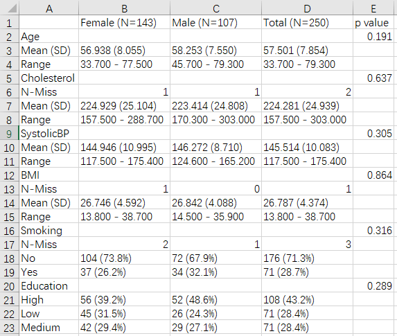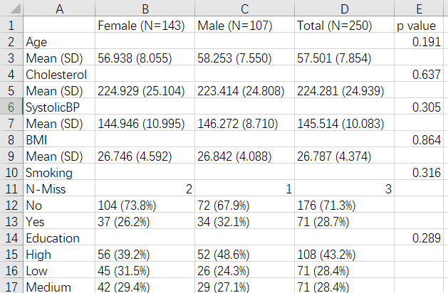 |             |  Female (N=143)   |   Male (N=107)    |   Total (N=250)   | p value|